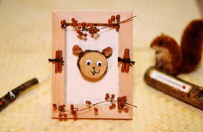 間伐材を切って、マツボックリの耳を付けて楽しんで作ってました。
