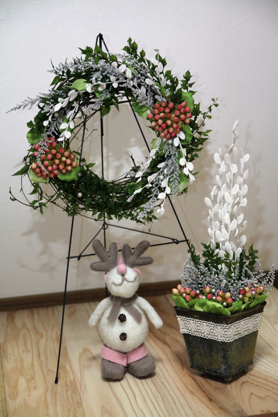 トナカイのぬいぐるみに合わせて、リースとポットアレンジを作ってみました。